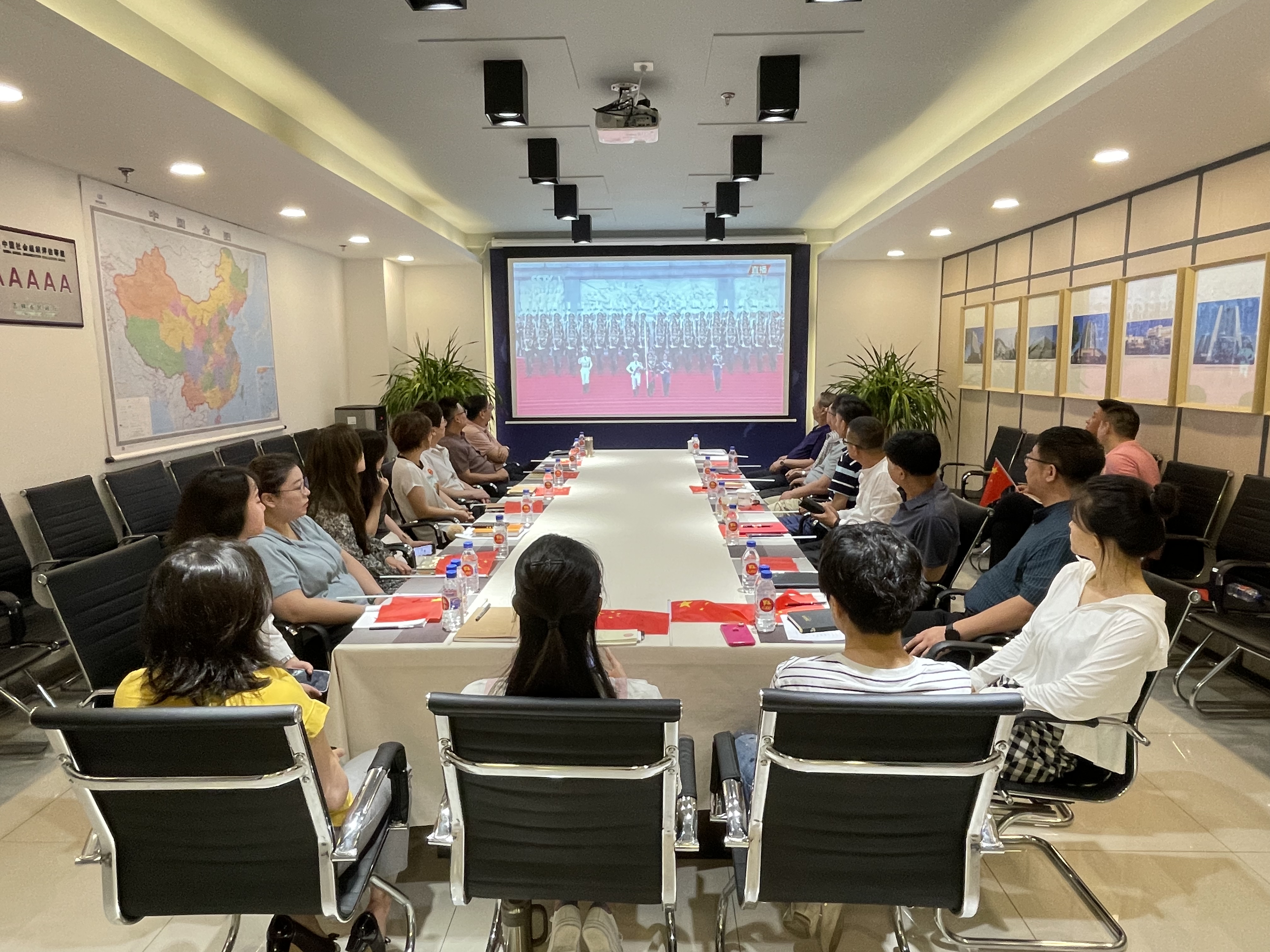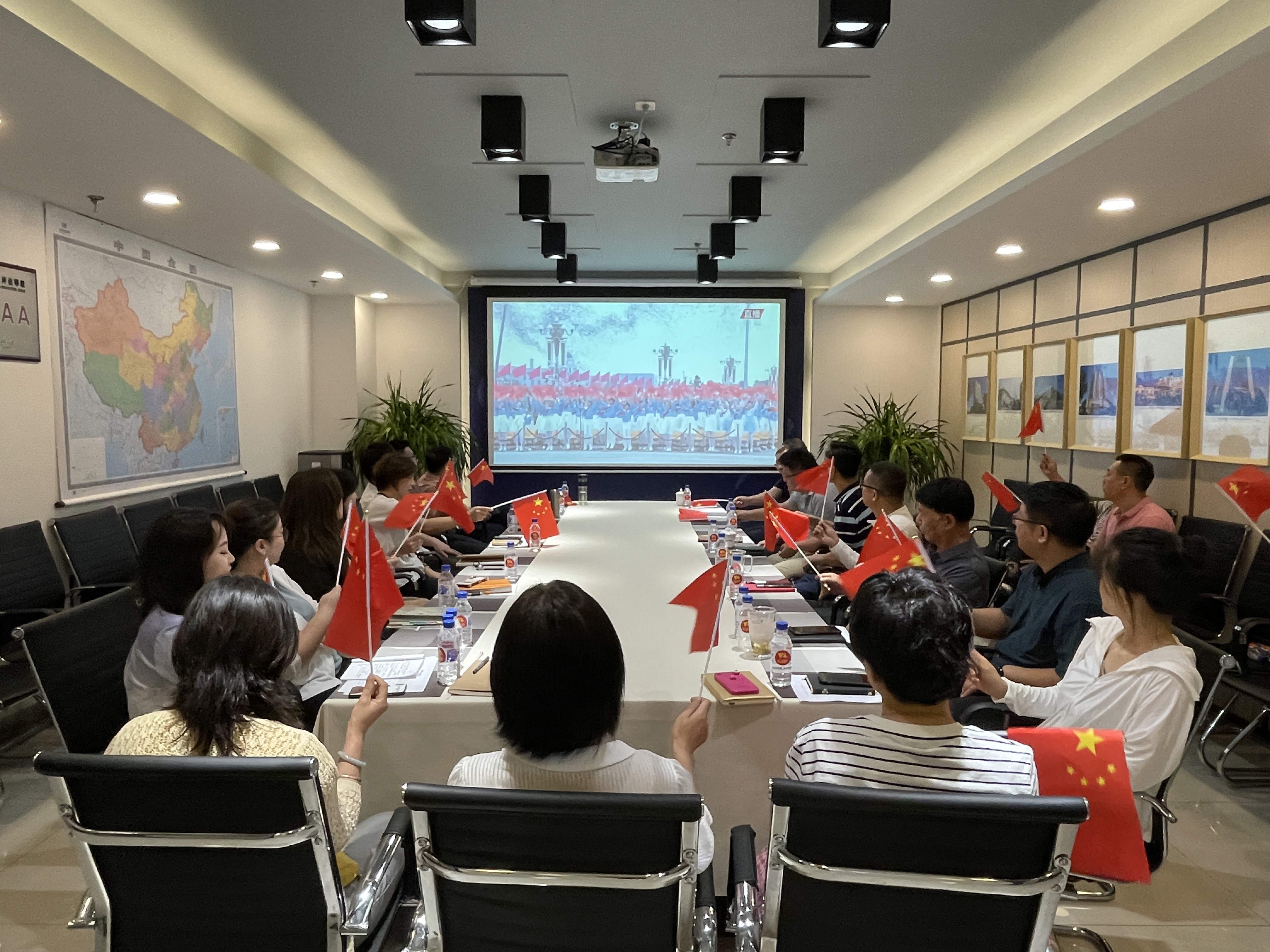 7月1日8点前,省建协全体员工整齐地坐在会议室,每人手拿一面小国旗,以十分激动的心情,等待着收看庆祝中国共产党成立100周年大会实况直播。8点整,庆祝大会正式开始。从15架歼20军机以100造型横空飞过,到百响礼炮隆隆轰鸣;从200名红旗护卫队礼兵整齐有力的威武英姿,到充满青春朝气的共青团少先队员们庄严铿锵的誓言……一个个激动人心的场景画面,让员工们无不感到了一种心灵的巨大震撼,为我们党带领中国人民不畏艰难困苦牺牲,接续拼搏奋斗取得的伟大成就而感到骄傲和自豪。