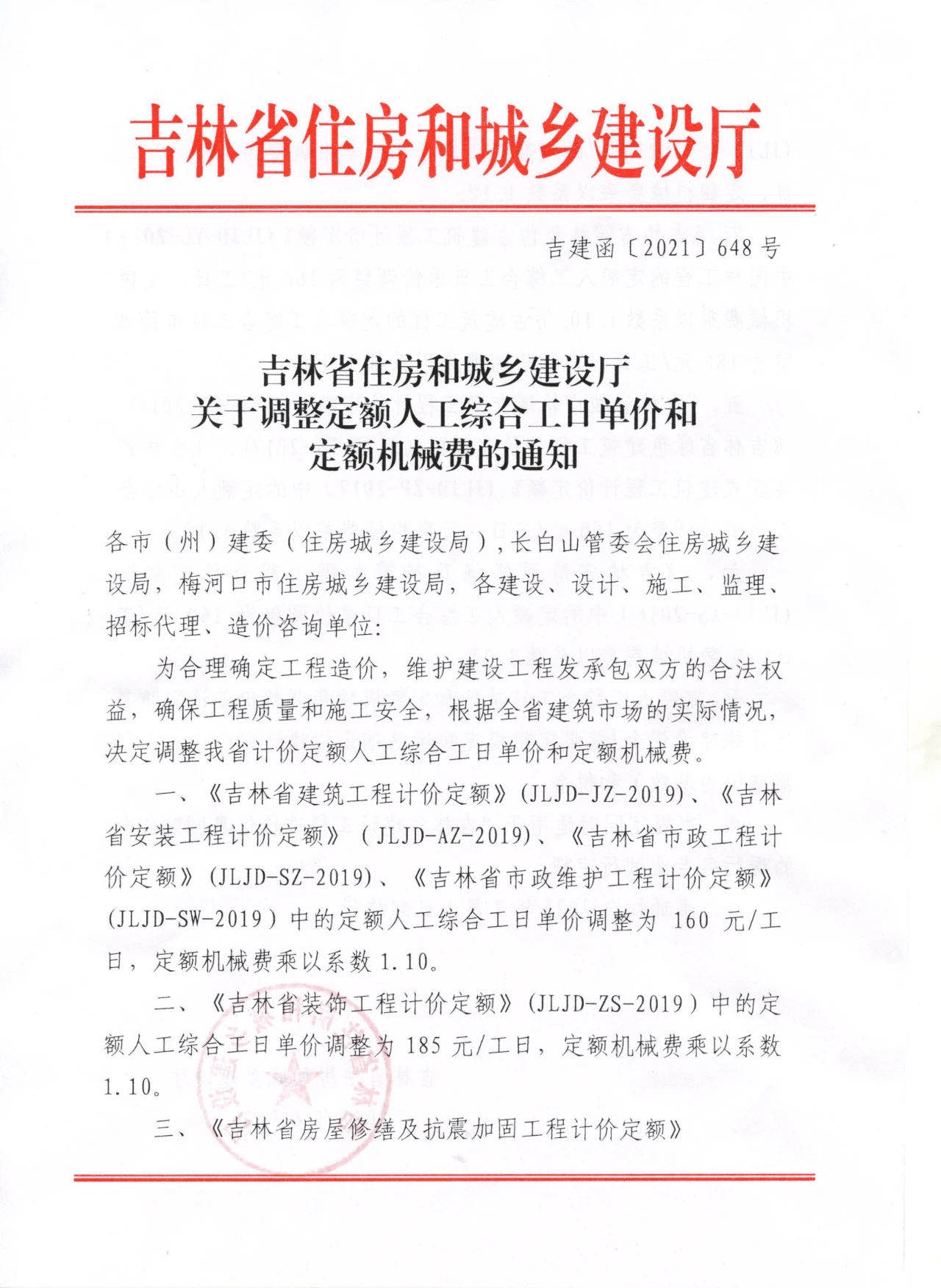 现将《吉林省住房和城乡建设厅关于调整定额人工综合工日单价和定额机械费的通知》(吉建函〔 2021 〕648号),转发到协会网站上,以便对照执行。