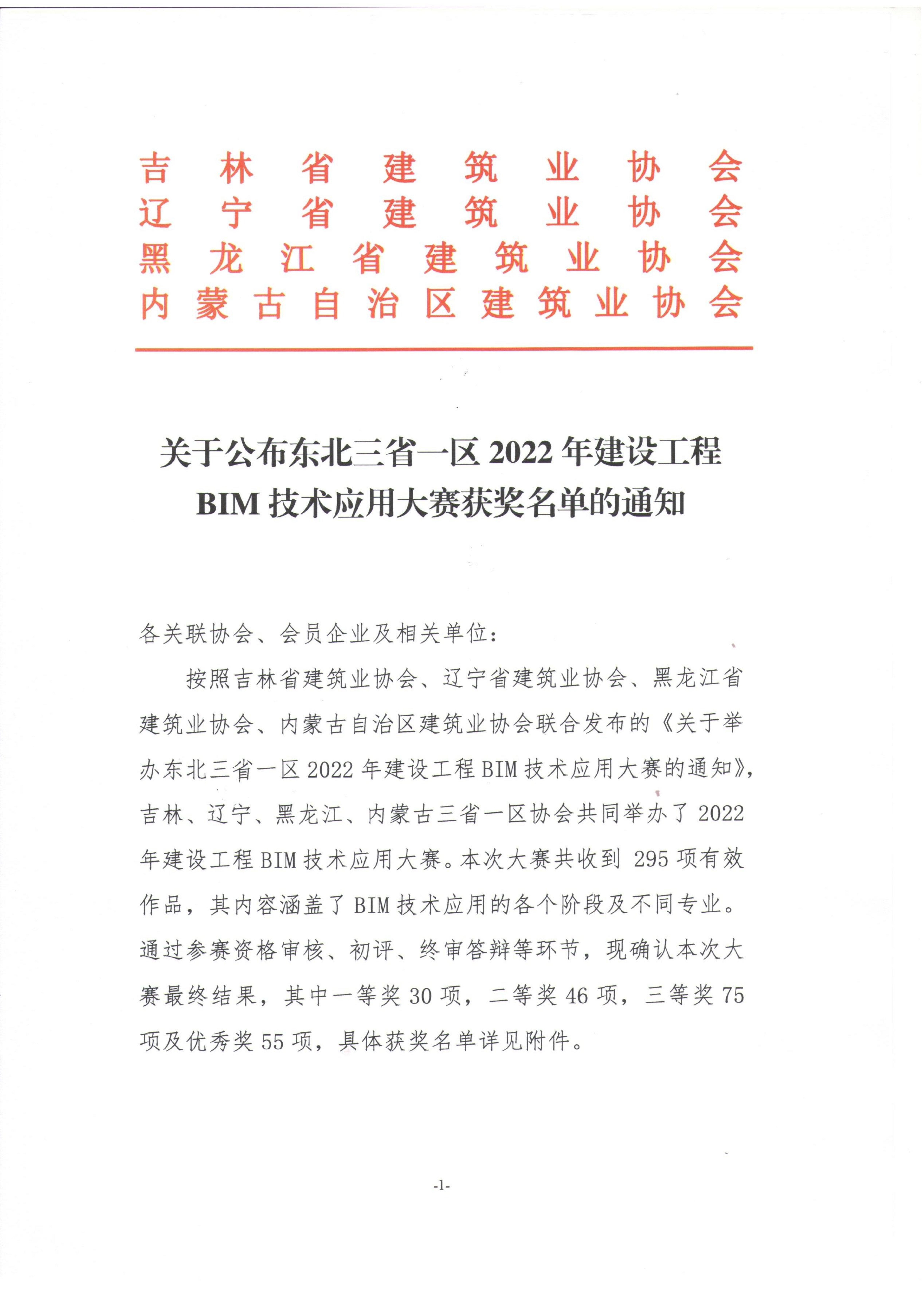 关于公布东北三省一区2022年建设工程BIM技术应用大赛获奖名单的通知