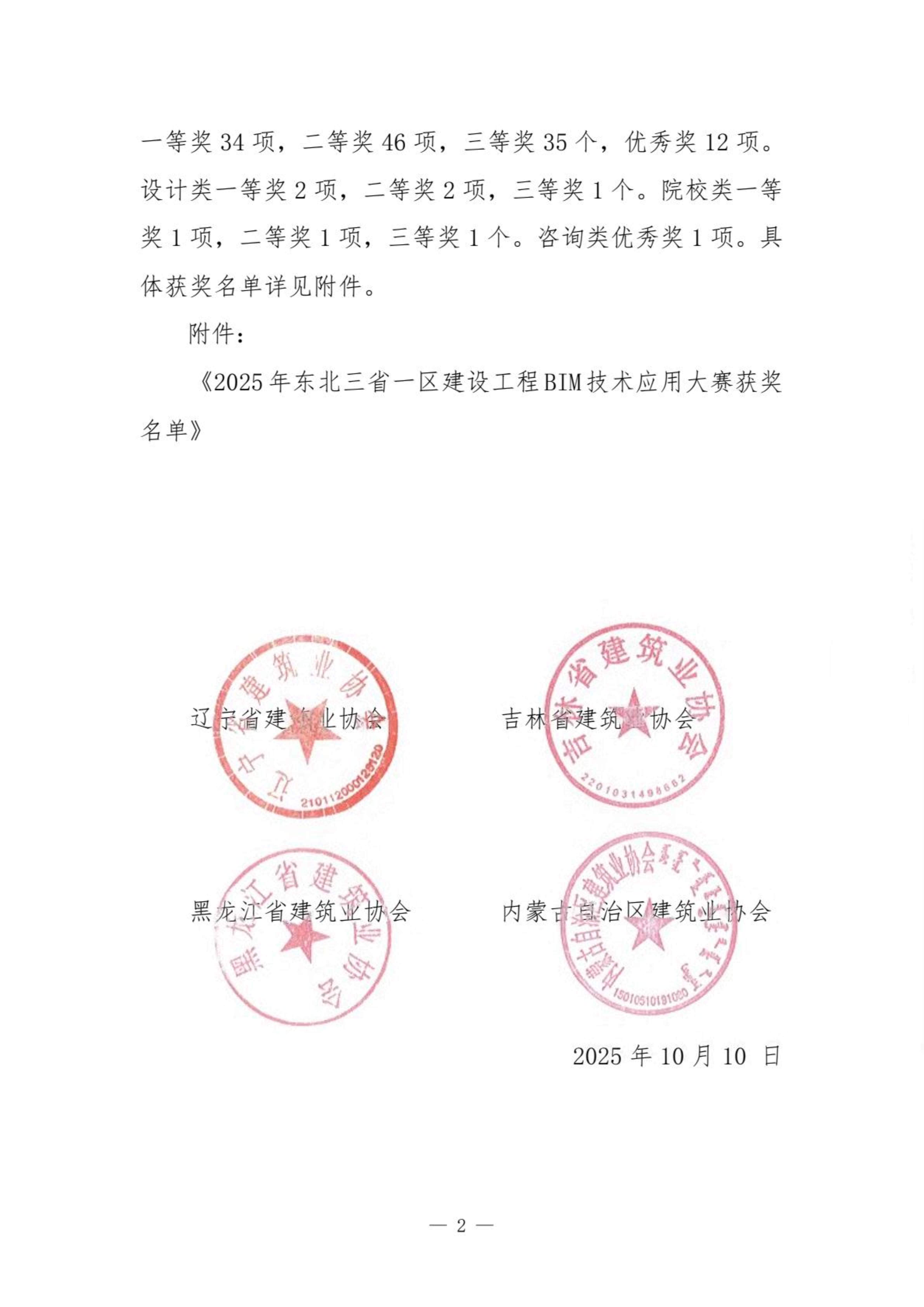 关于公布东北三省一区2025年度建设工程BIM技术应用大赛获奖名单的通知