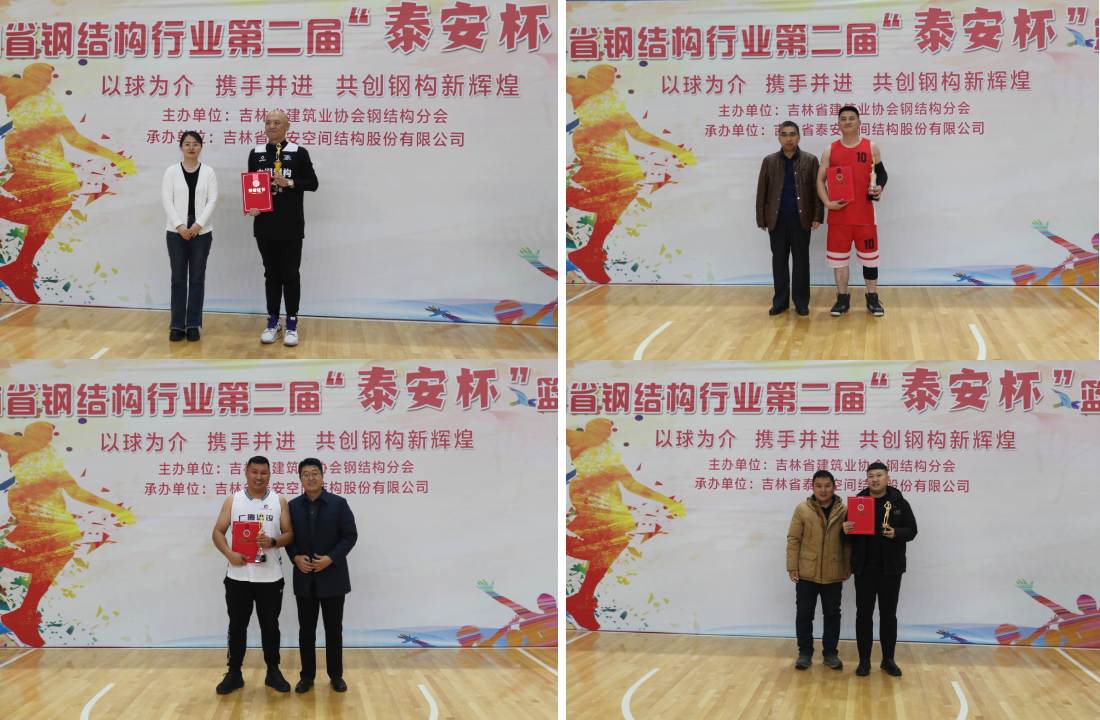 作为承办单位,吉林省泰安空间结构股份有限公司被授予“最佳组织奖”,吉林省泰安空间结构股份有限公司、吉林省众成建筑工程有限公司、吉林远大绿建科技有限公司、吉林省境和设计工程有限公司、吉林省金安达建筑工程有限公司获得“体育风尚奖”称号,吉林省众成建筑工程有限公司赵炜文荣获“投篮三分冠军”,大赛还为优秀裁判员颁发了荣誉证书。