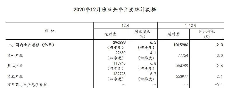 初步核算,全年国内生产总值1015986亿元,按可比价格计算,比上年增长2.3%。