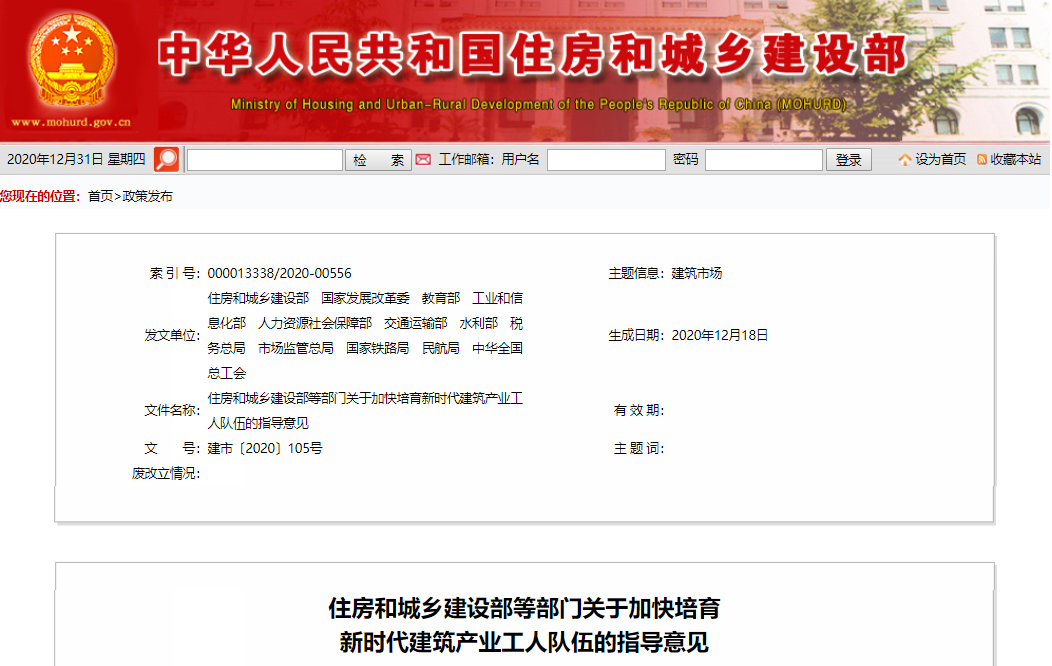 近日,住房和城乡建设部等12部门联合印发了《关于加快培育新时代建筑产业工人队伍的指导意见》(以下简称《指导意见》),提出以推进建筑业供给侧结构性改革为主线,以夯实建筑产业基础能力为根本,以构建社会化专业化分工协作的建筑工人队伍为目标,深化“放管服”改革,建立健全符合新时代建筑工人队伍建设要求的体制机制,为建筑业持续健康发展和推进新型城镇化提供更有力的人才支撑。