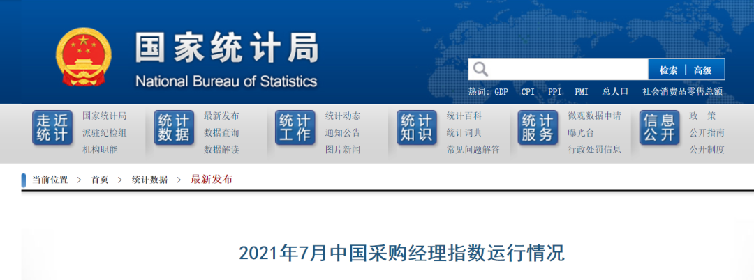近日,国家统计局发布2021年7月中国采购经理指数运行情况。数据显示,7月份中国制造业采购经理指数、非制造业商务活动指数和综合PMI产出指数分别为50.4%、53.3%和52.4%,比上月回落0.5、0.2和0.5个百分点,我国经济继续保持扩张态势,但步伐有所放缓。