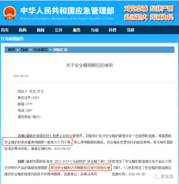 回复:强制性国家标准GB 2811-2019《头部防护 安全帽》第7.2条款规定了安全帽的制造商应在产品永久标识中明示产品的强制报废期限,即当安全帽到达该期限后应进行报废处理;同时,7.3条款规定了安全帽的制造商应提供安全帽的报废判别条件和使用期限。回复单位: 政策法规司 回复时间: 2021-06-28