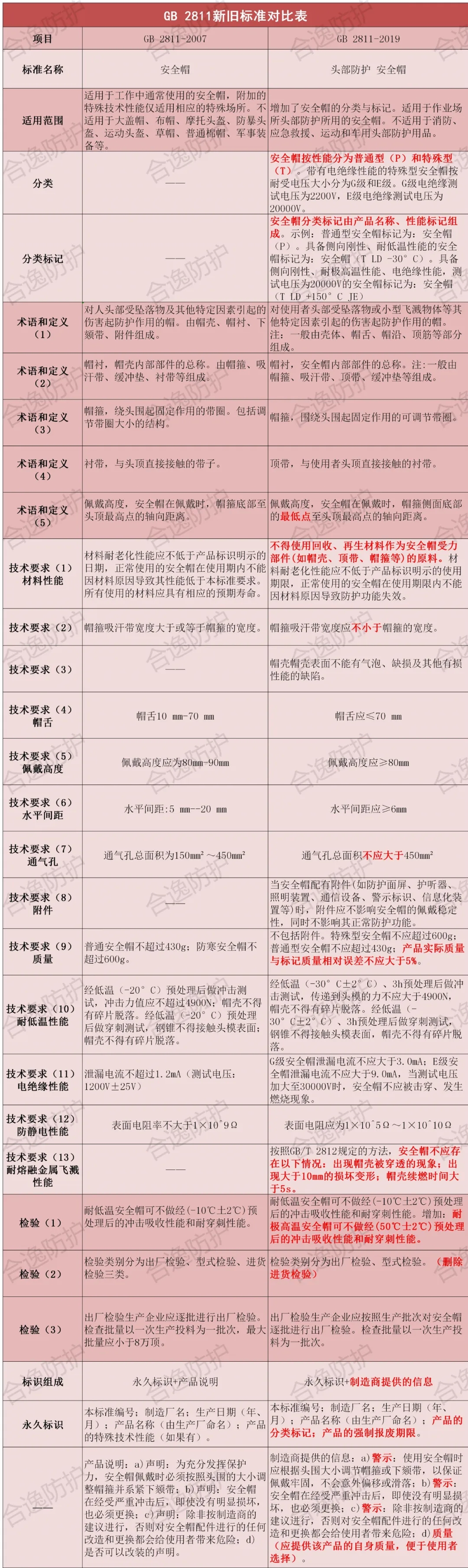 GB 2811-2019《头部防护 安全帽》与GB 2811-2007《安全帽》相比,主要技术变化如下表所示: