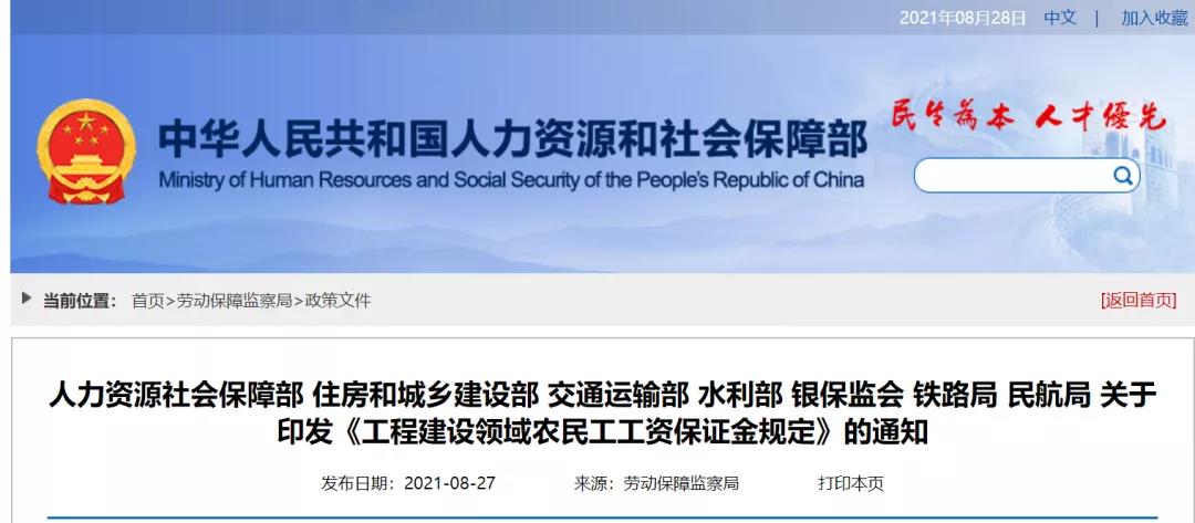 根据《保障农民工工资支付条例》授权,人力资源社会保障部、住房和城乡建设部、交通运输部、水利部、银保监会、铁路局、民航局制定了《工程建设领域农民工工资保证金规定》。现印发给你们,请贯彻执行。