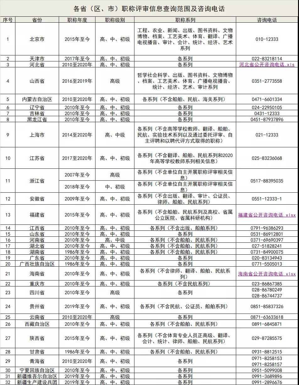 1.首批可供查询的职称评审信息范围及咨询电话详见《各省(区、市)职称评审信息查询范围及咨询电话》(附件1)。职称评审采取属地化管理,如对查询结果有疑问,可联系当地职称评审机构。
