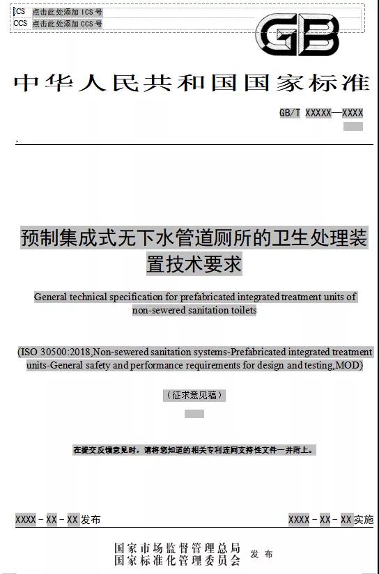 国家标准《预制集成式无下水管道厕所的卫生处理装置技术要求(征求意见稿)》