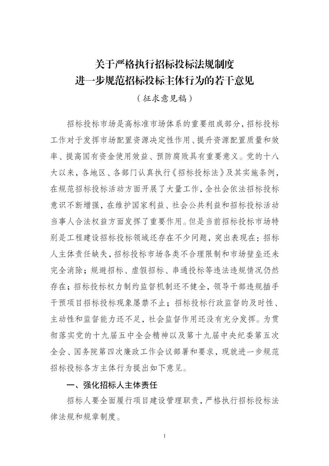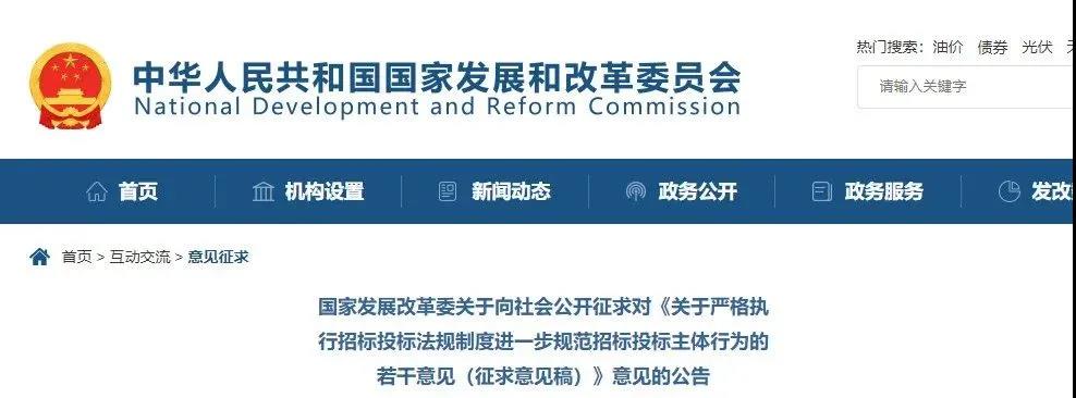 近日,国家发改委官网发布:《关于严格执行招标投标法规制度进一步规范招标投标主体行为的若干意见(征求意见稿)》和《关于进一步规范公共资源交易平台服务行为的若干意见(征求意见稿)》向社会公开征求意见,此次征求意见截止时间为10月30日。