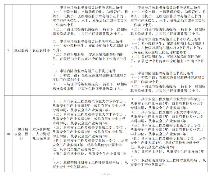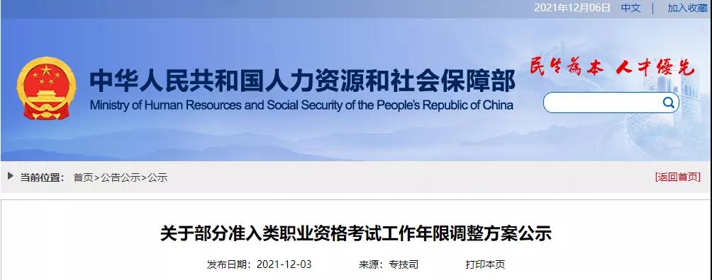为贯彻落实《政府工作报告》要求,推动降低就业门槛,我部会同国务院有关部门研究制定了部分准入类职业资格考试工作年限调整方案。现予以公示,公示期7天。如有意见建议,请于2021年12月9日之前通过电话、电子邮件等形式反馈人力资源社会保障部专业技术人员管理司。