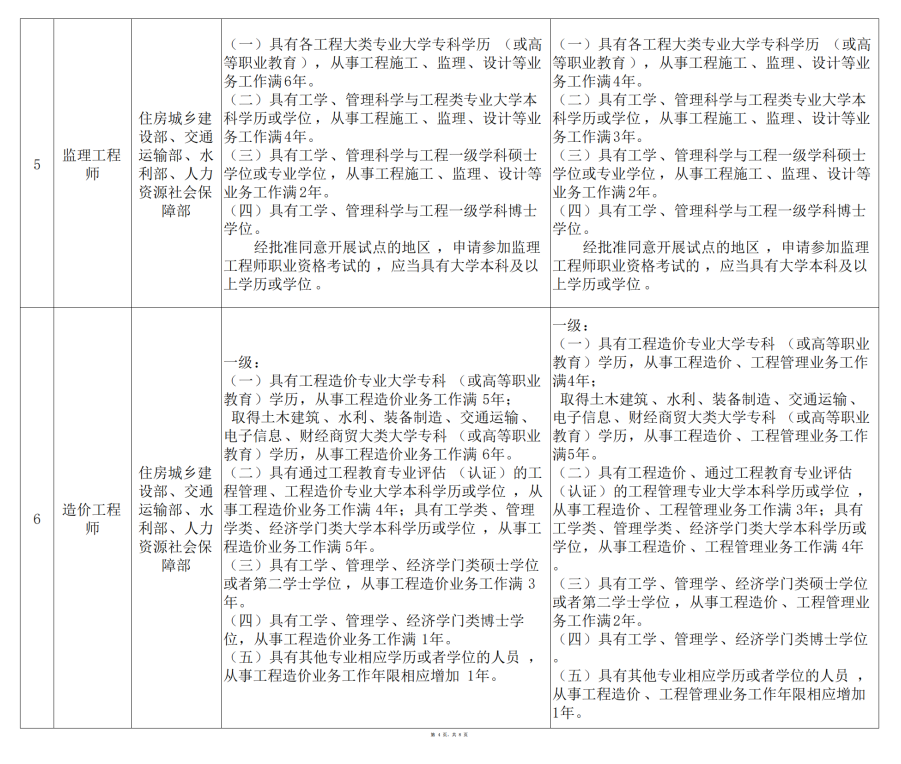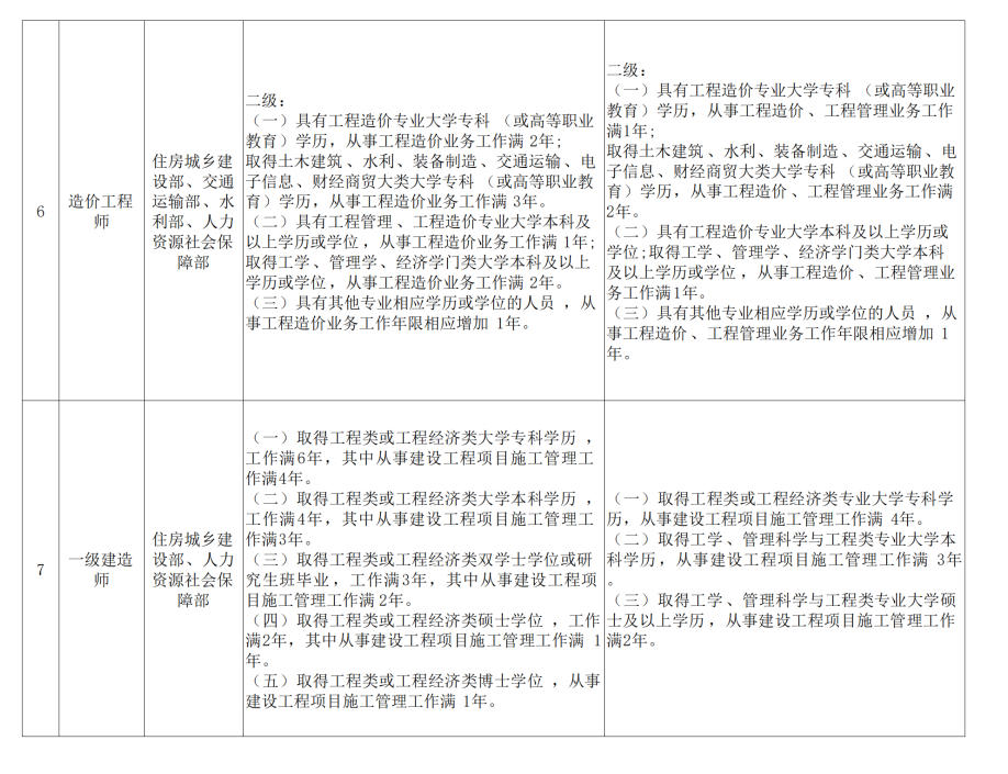 (二)具有通过工程教育专业评估(认证)的工程管理、工程造价专业大学本科学历或学位,从事工程造价业务工作满4年;具有工学类、管理学类、经济学门类大学本科学历或学位,从事工程造价业务工作满5年。
