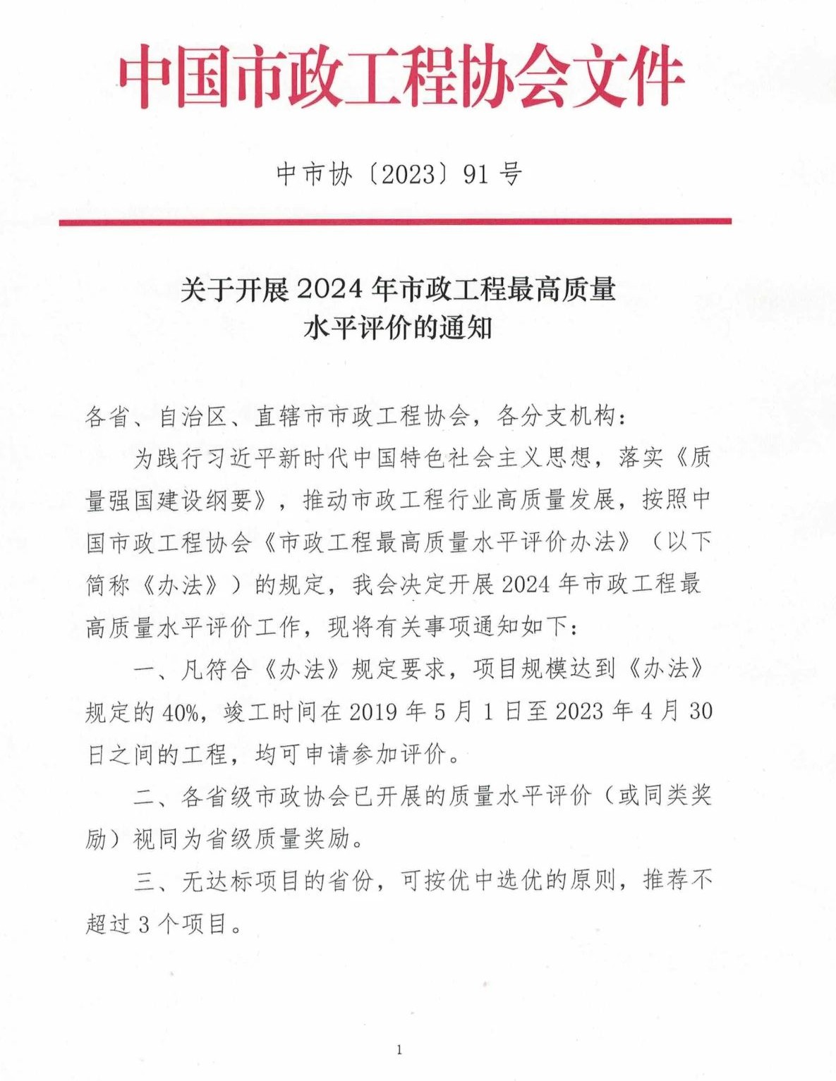 现将中国市政工程协会《关于开展2024年市政工程最高质量水平评价的通知》转发给你们,请符合申报条件的会员企业按照《市政工程最高质量水平评价办法》(附件1)的要求自愿申报。各会员企业将申报材料(附件2和附件3)报送至吉林省市政工程协会后,协会将组织专家进行评审,择优推荐并统一报送至中国市政工程协会质量评价小组。